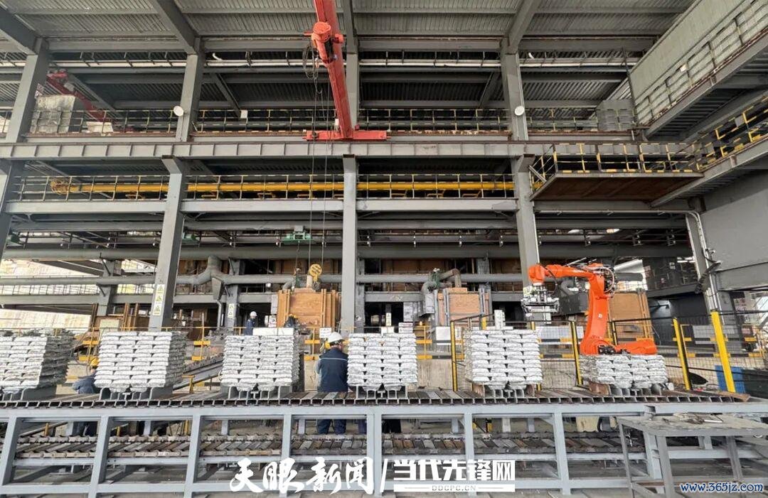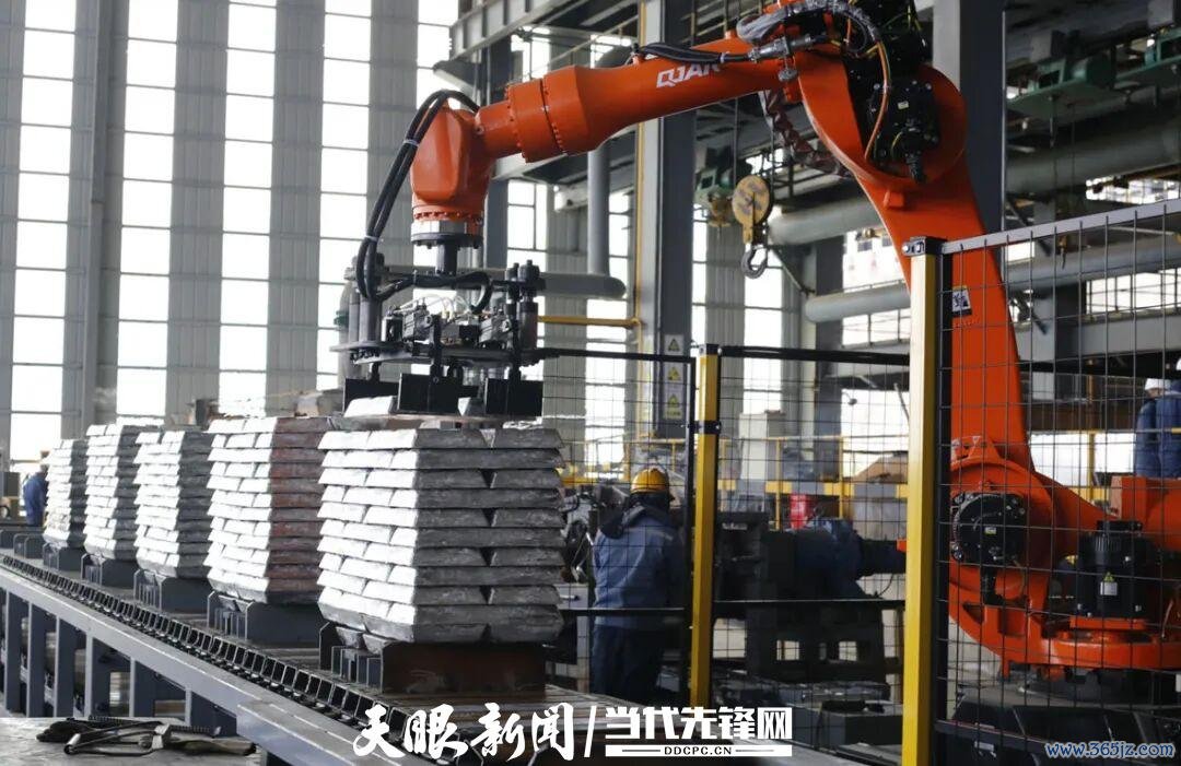 西能锌业内的机械臂正在码放刚下线的锌锭